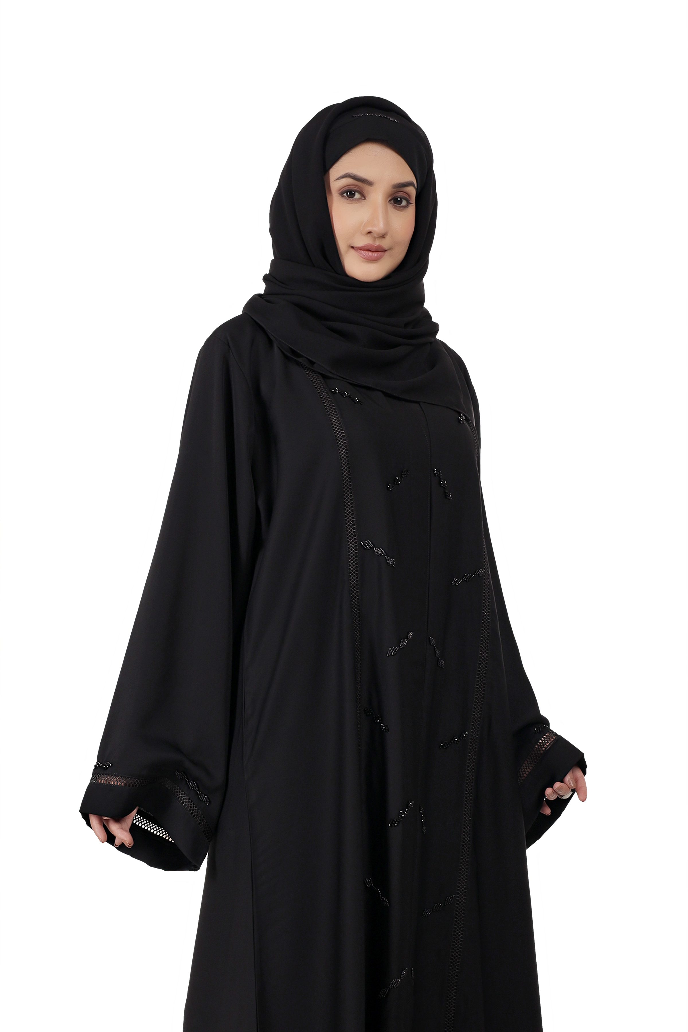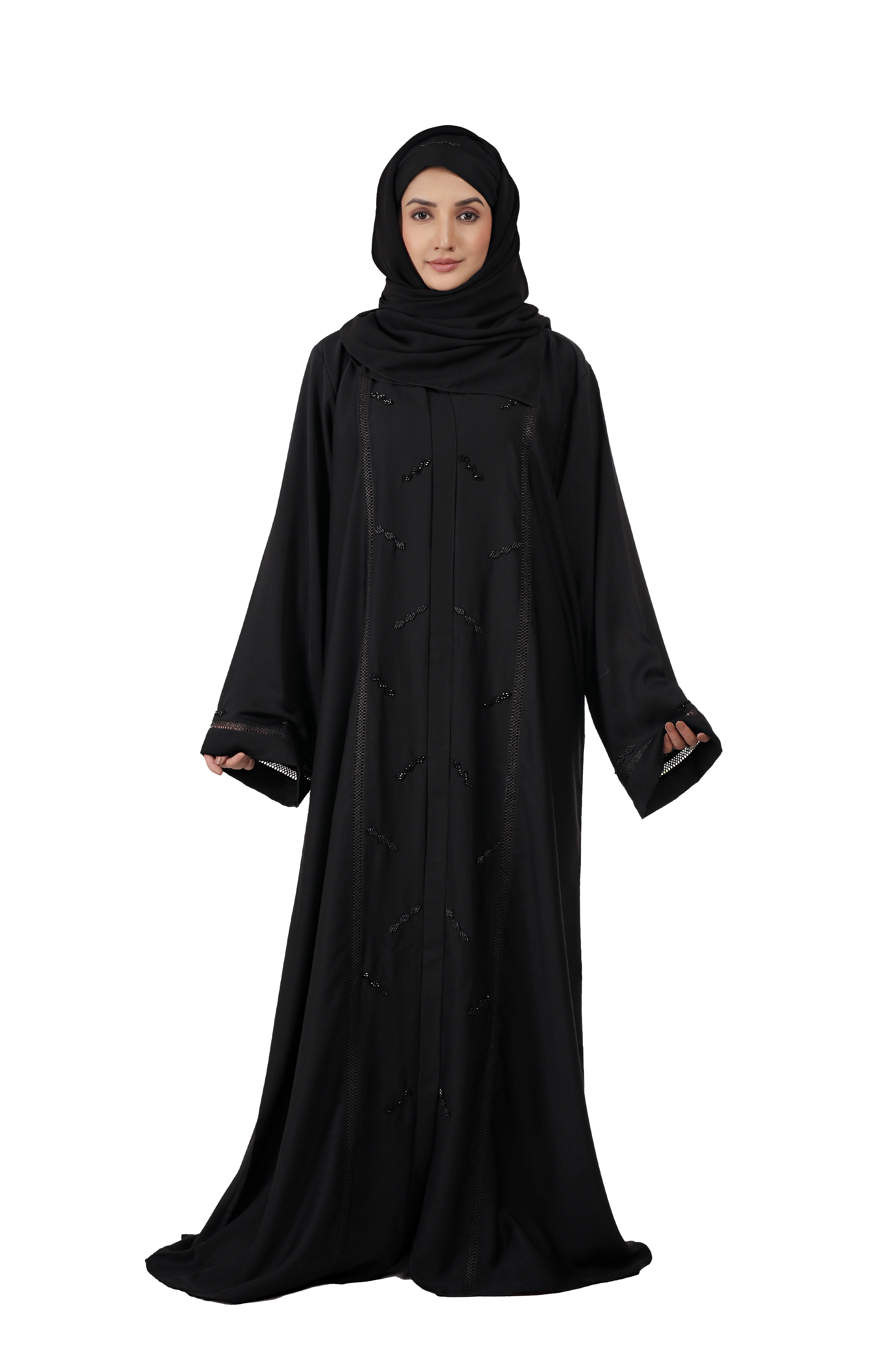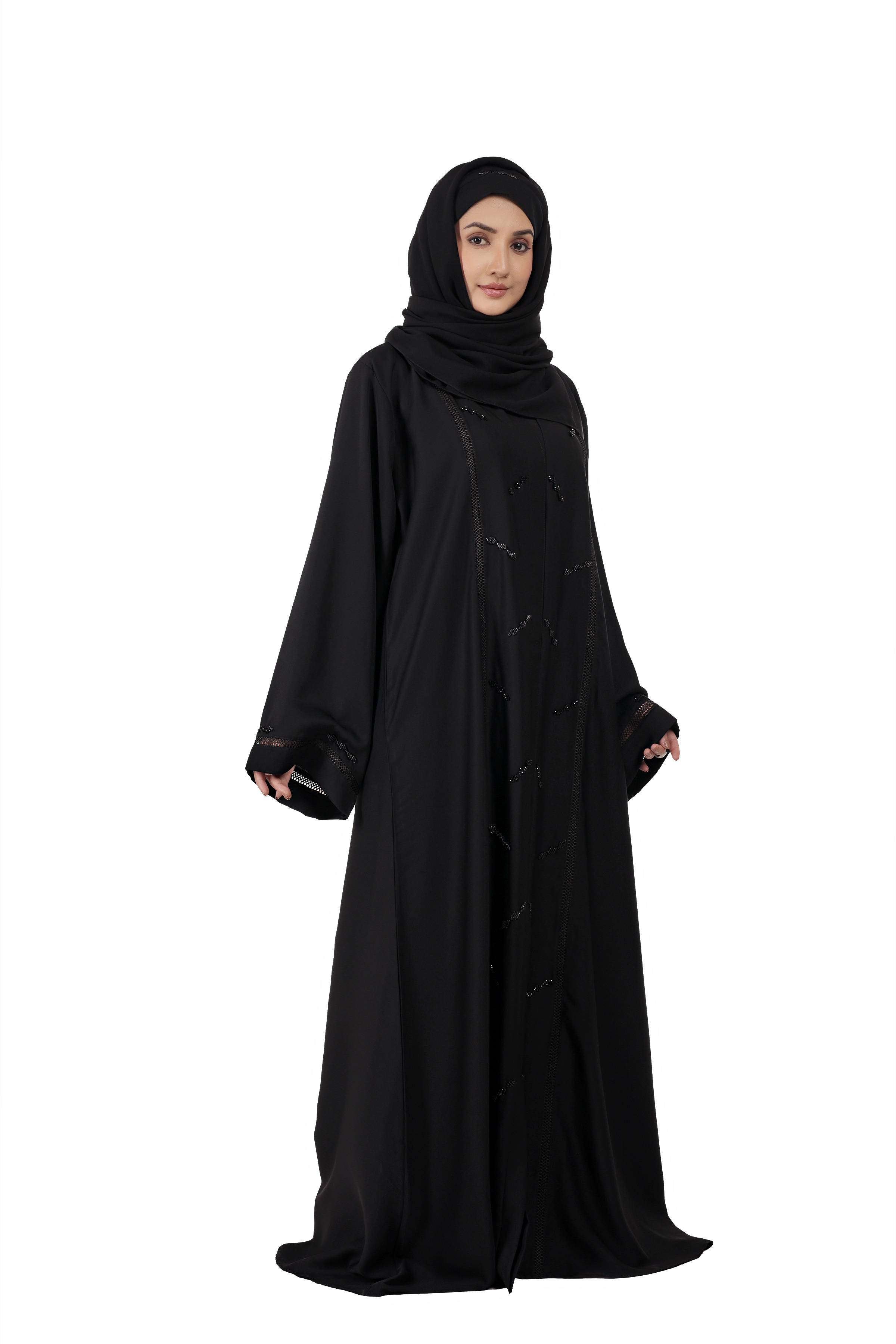 Elegant Black Abaya crafted in premium imported Nida fabric. Front-open style with matching computer work design on front & back. Perfect blend of daily wear comfort and graceful occasion look.