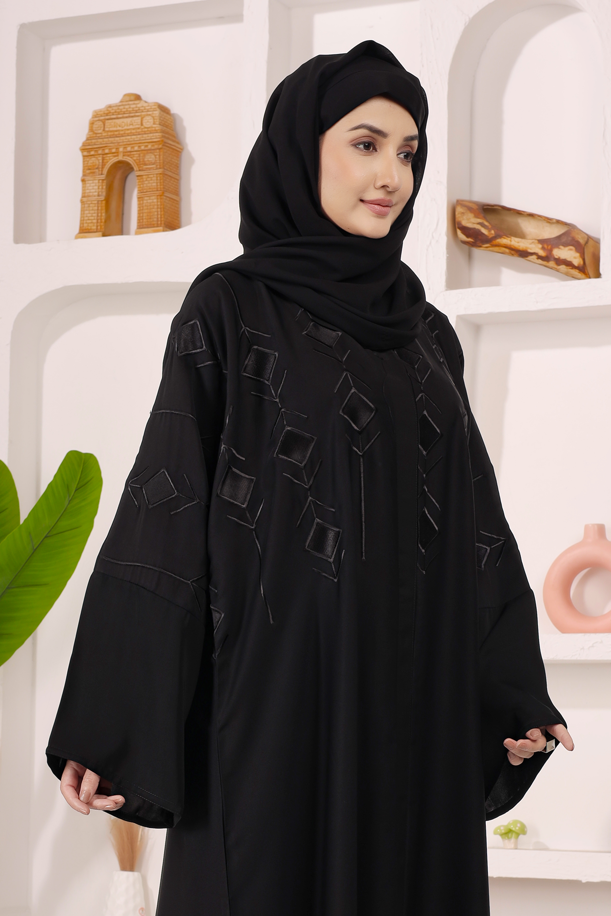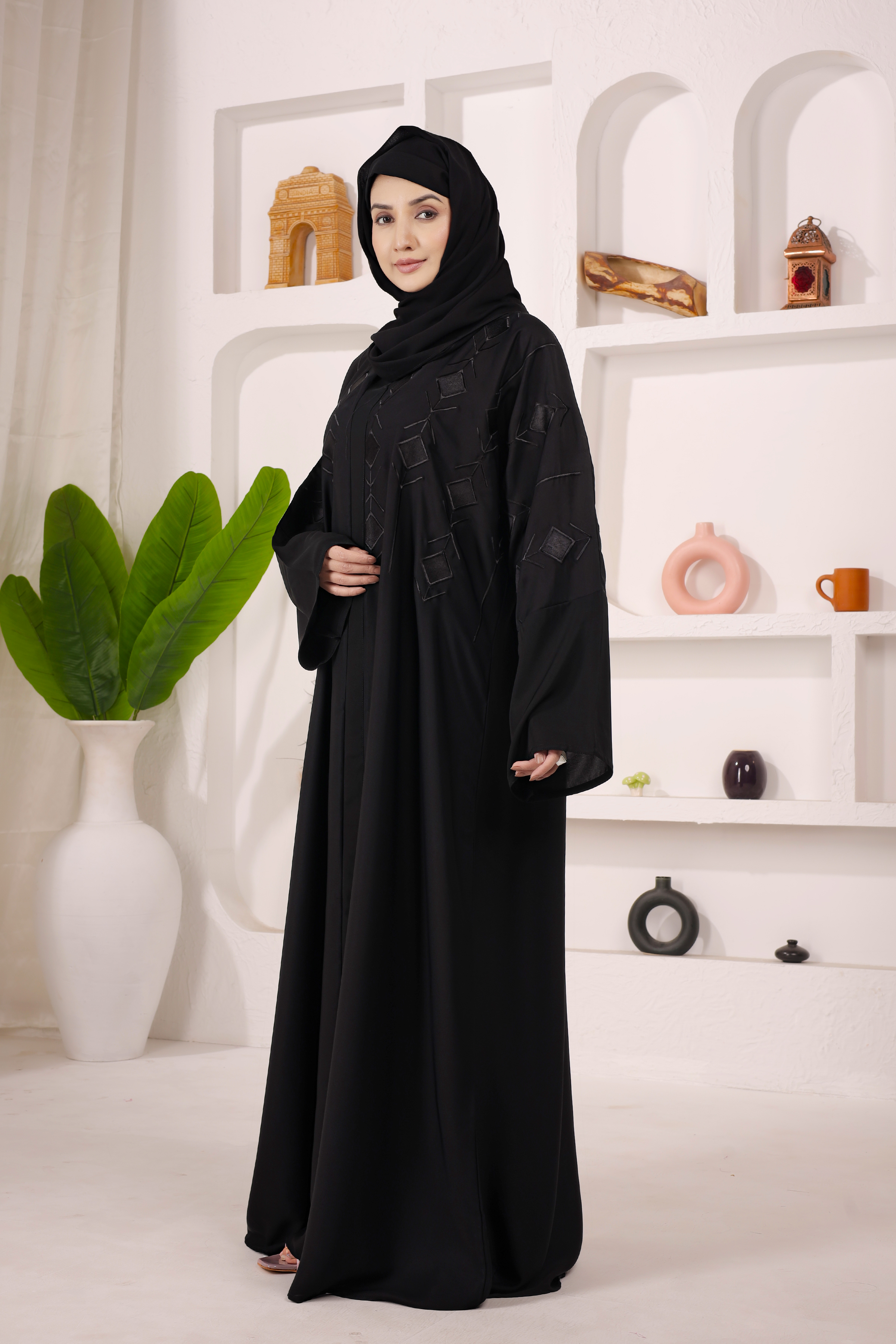 Elegant Black Abaya crafted in premium imported Nida fabric. Front-open style with matching computer work design on front & back. Perfect blend of daily wear comfort and graceful occasion look
