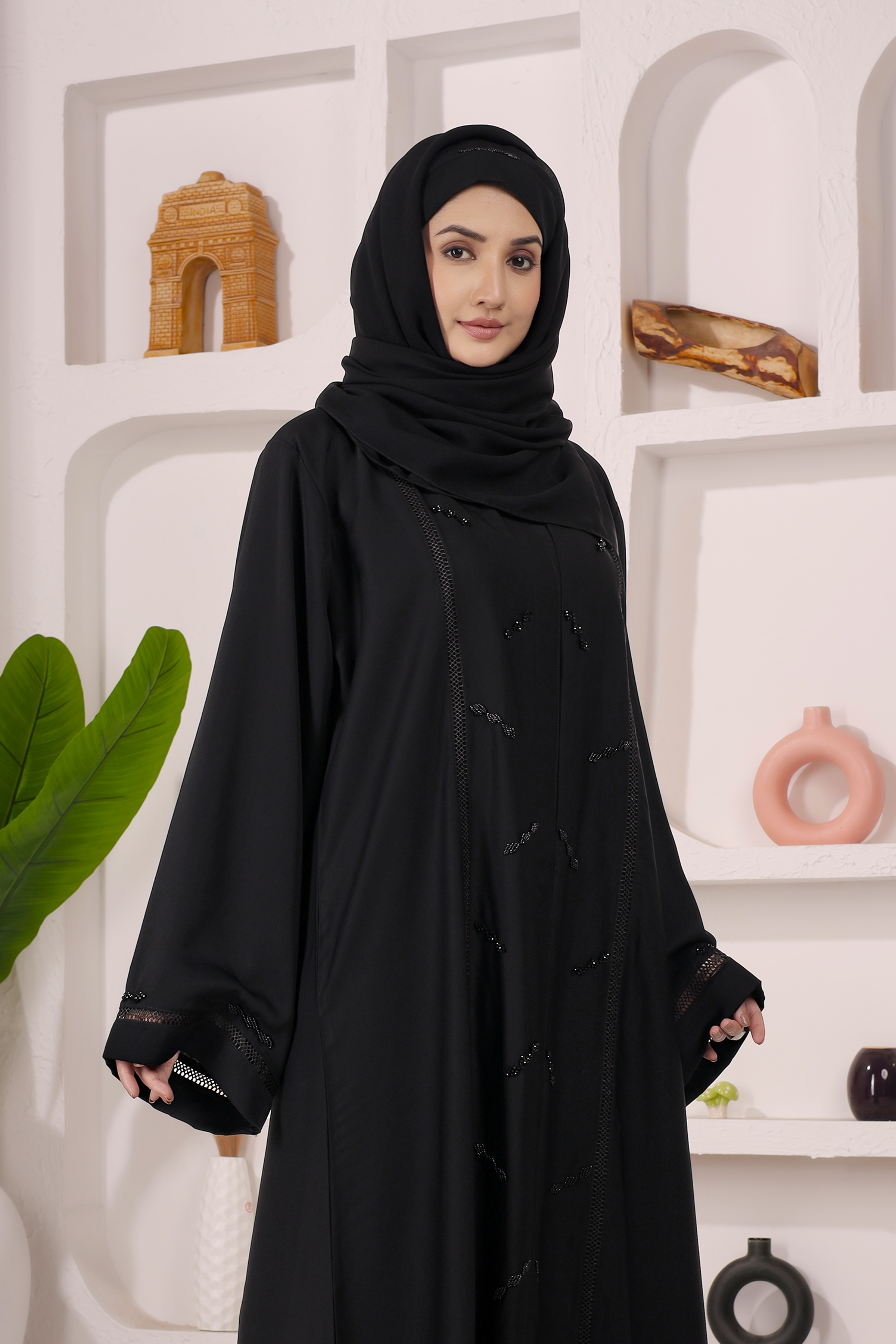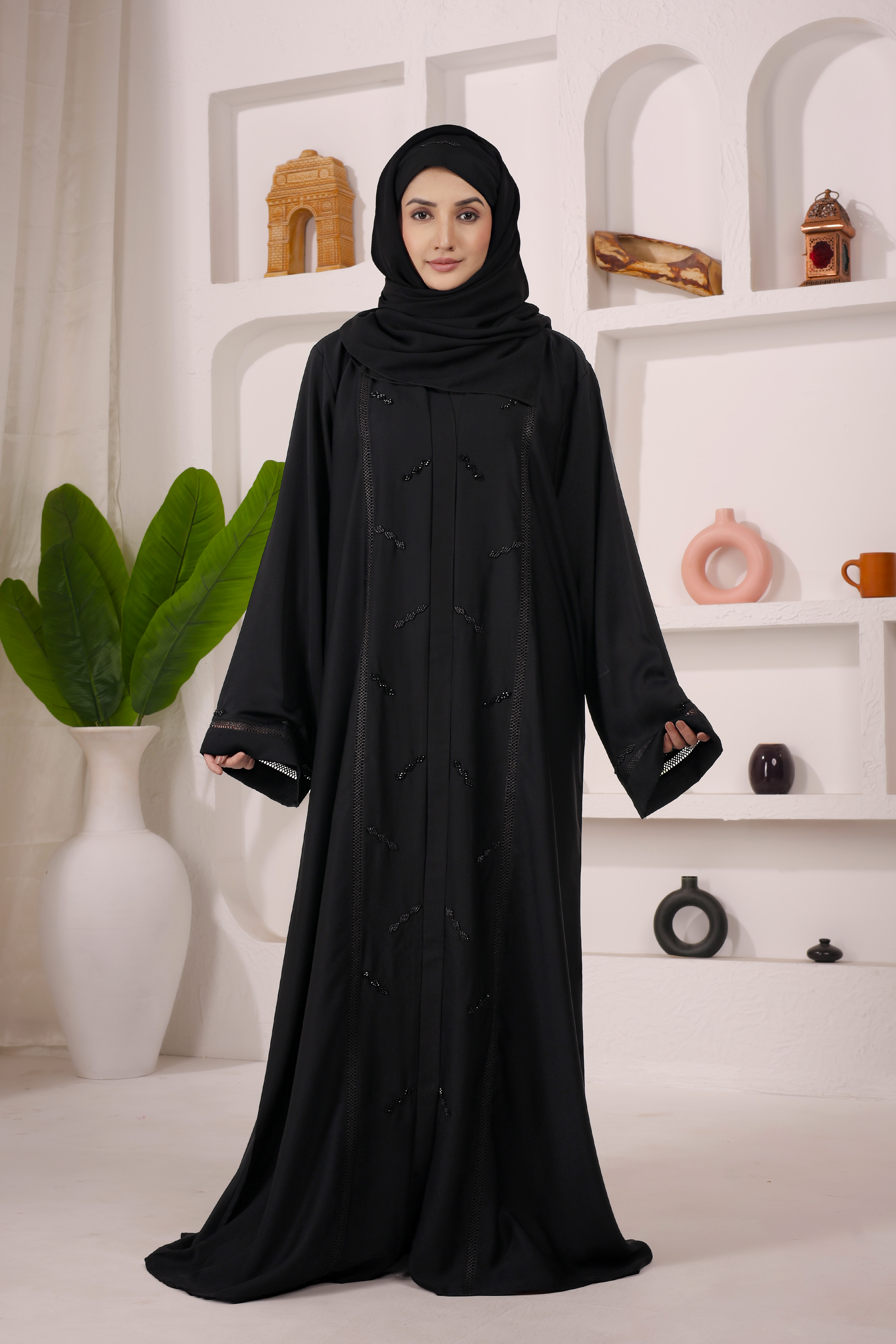 Elegant Black Abaya crafted in premium imported Nida fabric. Front-open style with matching computer work design on front & back. Perfect blend of daily wear comfort and graceful occasion look.
