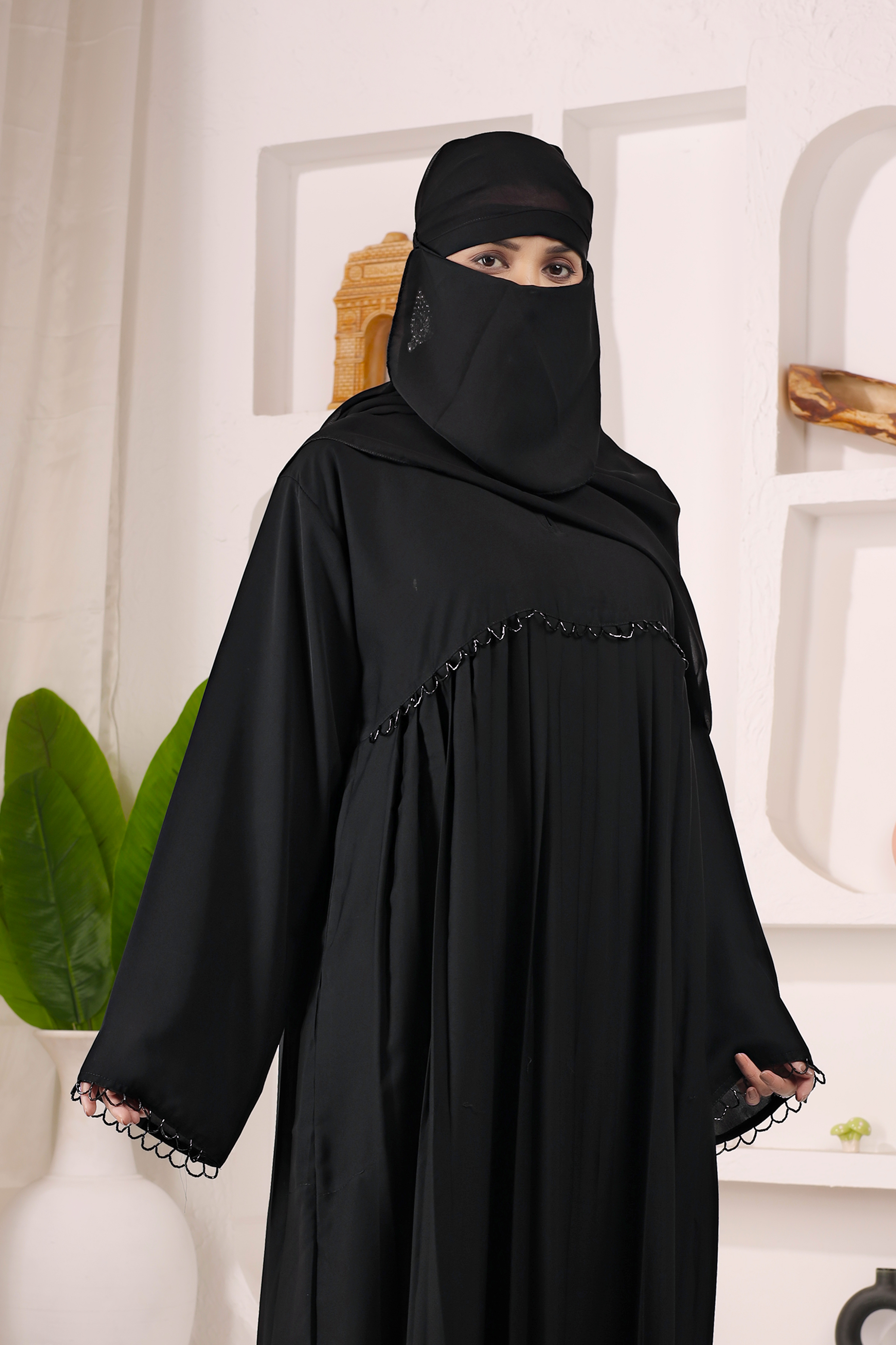 Discover elegance with our Noor-E-Haya Abaya in premium imported Nida fabric. Featuring platted handwork design on sleeves and dupatta, this lightweight abaya is perfect for daily wear & special occasions.