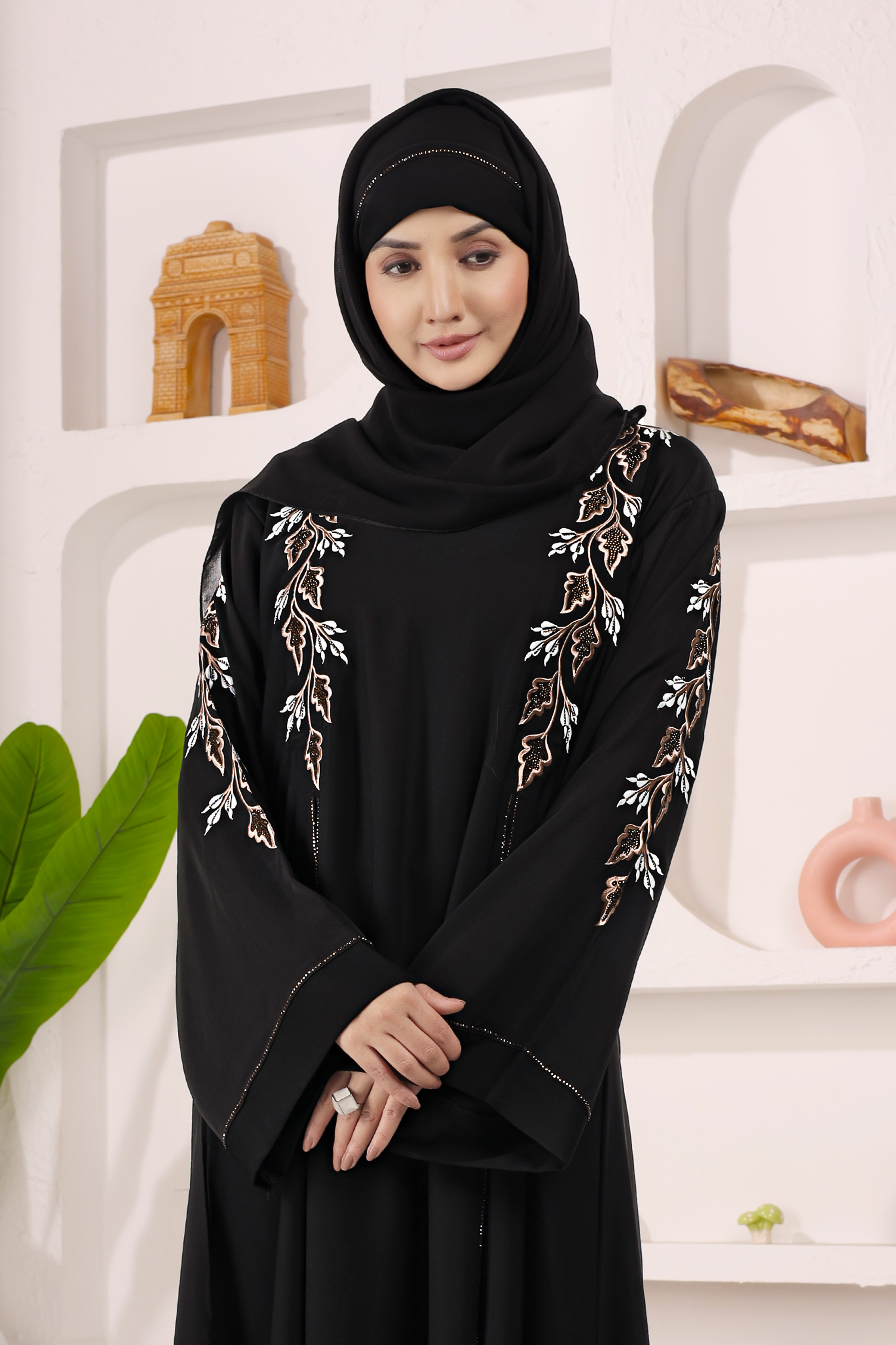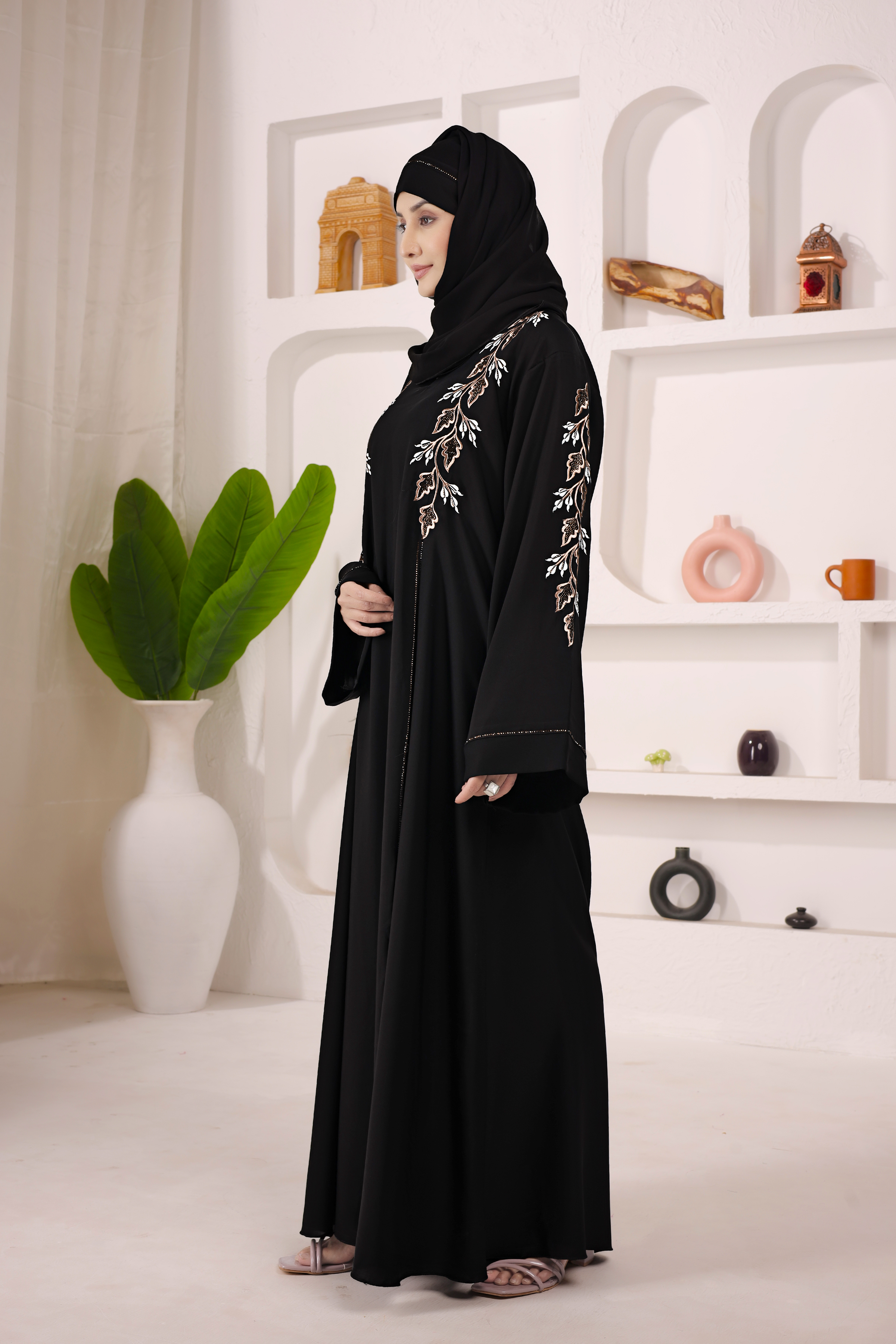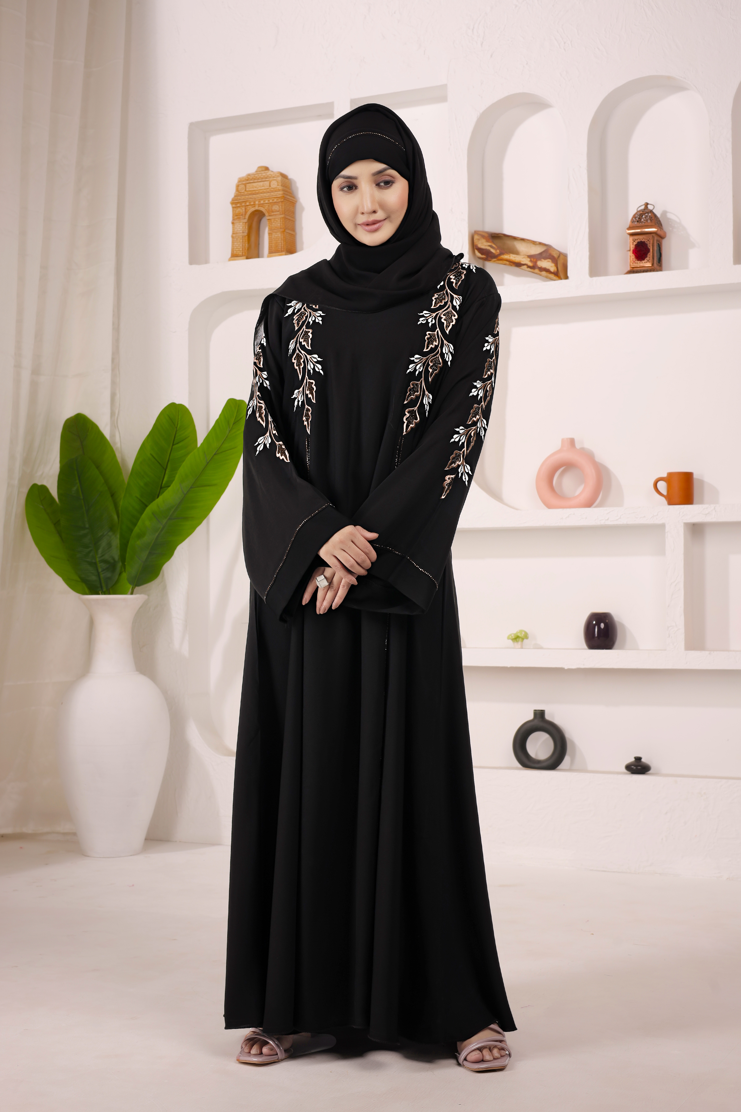 Elegant black abaya crafted in premium imported Nida fabric, featuring computer work and DMC diamond design on front, back, and sleeves. Lightweight, trendy, and perfect for daily wear.