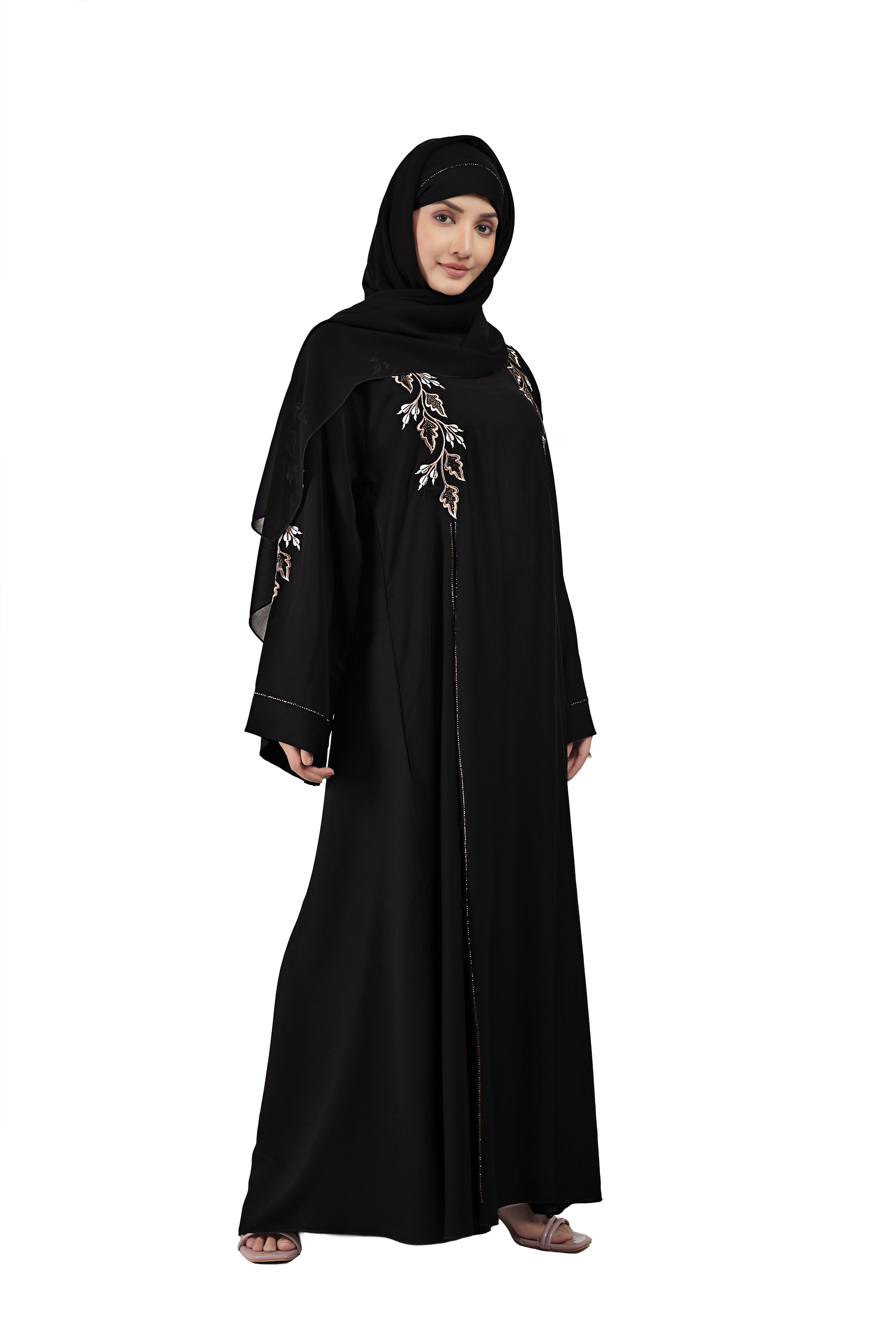Elevate your modest wardrobe with our Embroidered Black Abaya, where traditional elegance meets subtle artistry. Crafted from soft, breathable fabric (Nida or Georgette), this abaya features delicate embroidery that adds a touch of sophistication without overpowering the look. Ideal for formal gatherings, family events, or Friday prayers, it offers effortless grace with every step. The flowing silhouette ensures comfort, while the intricate embroidery brings a unique, feminine touch to a classic black base.