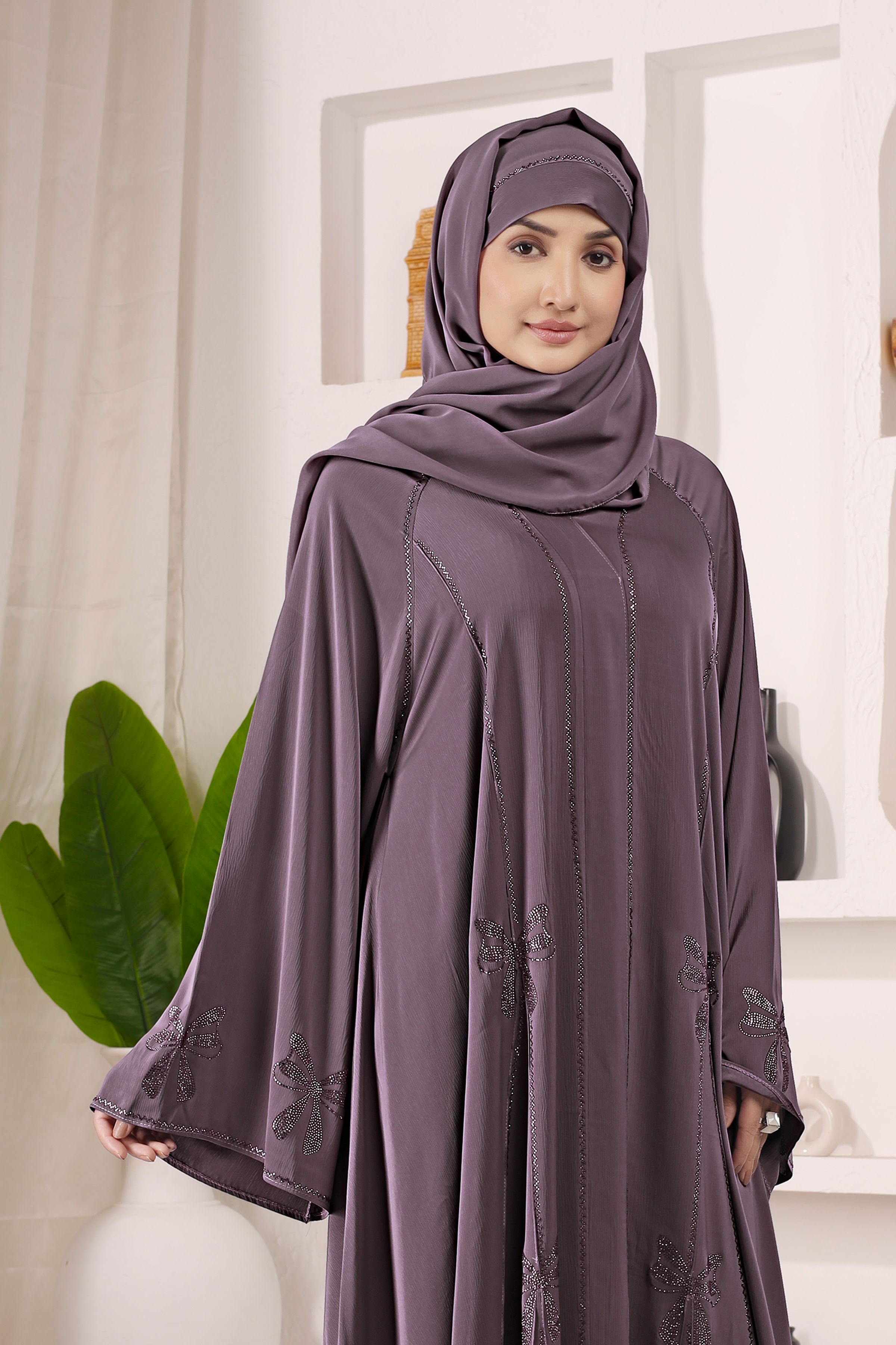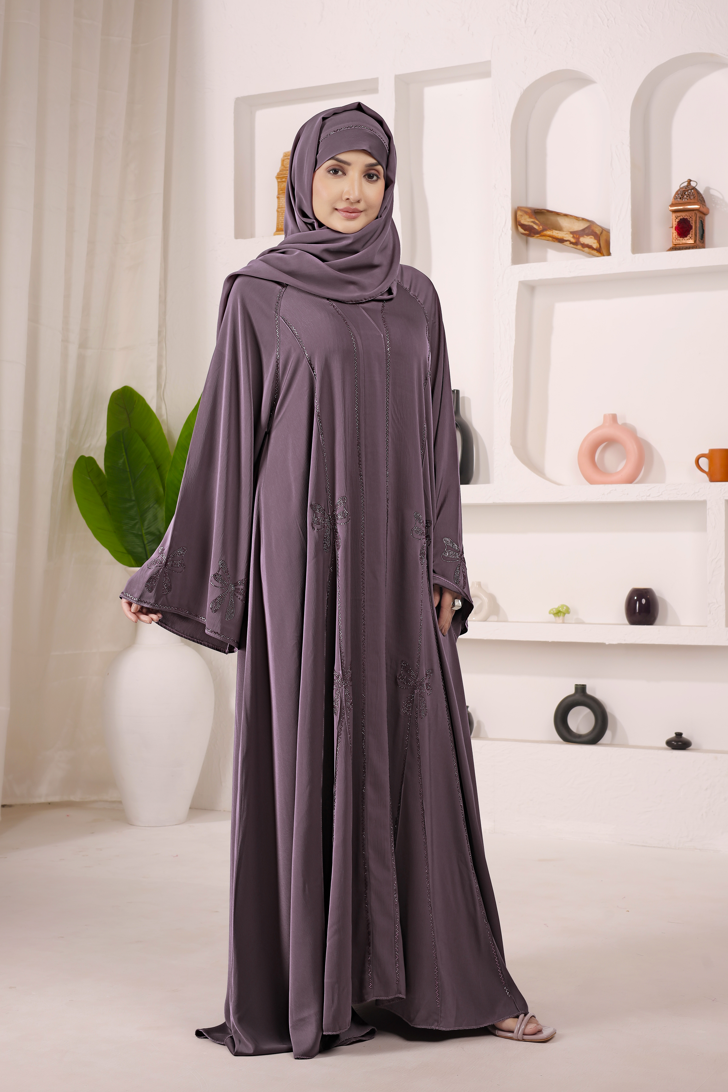Elegant full-gera abaya made from imported TikTok fabric. Features diamond handwork, umbrella sleeves, and full flare design for a graceful look. Perfect for special occasions and daily wear.